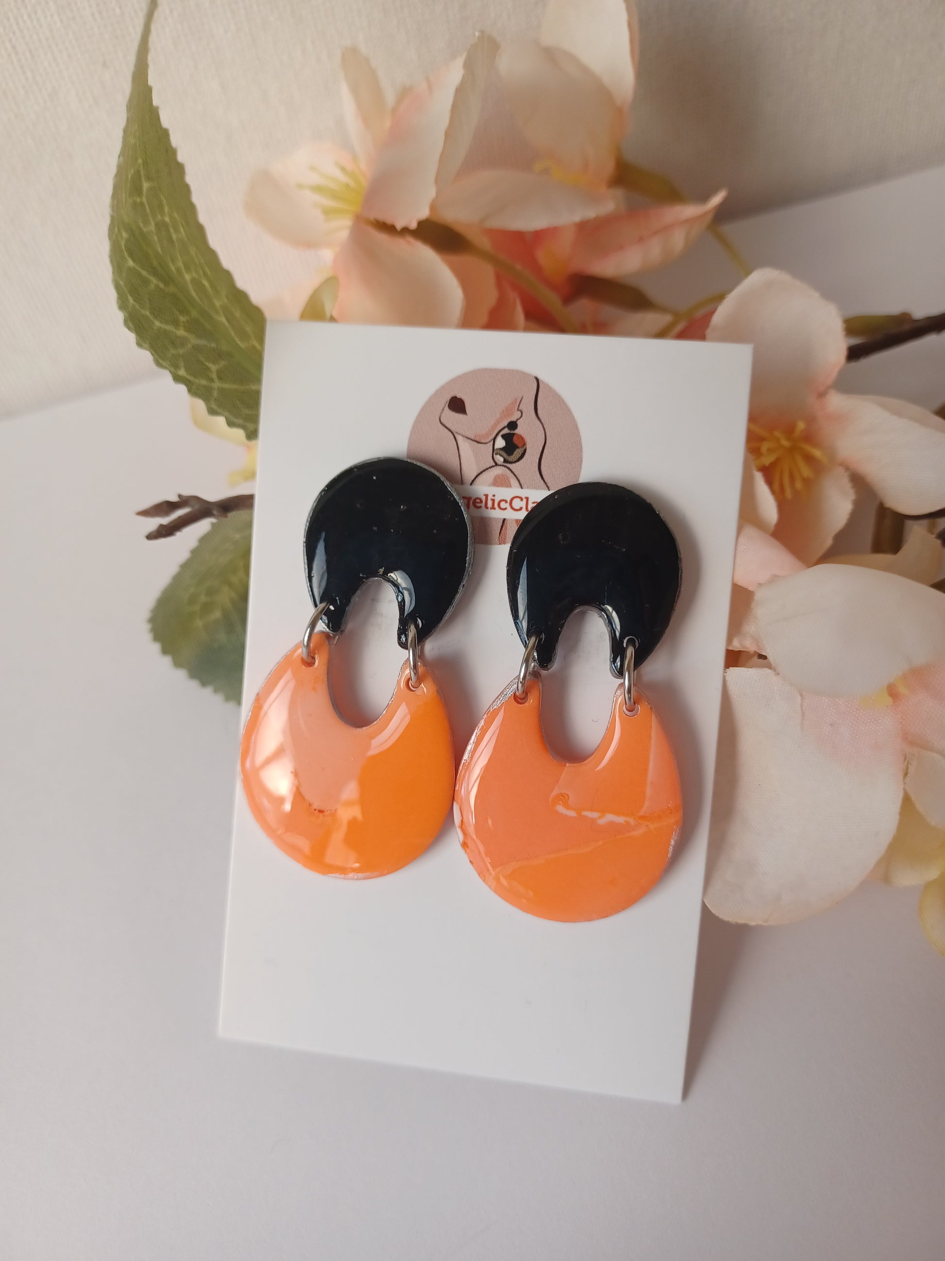 Bold polymer clay earrings with a striking contrast between the glossy black top circle and the vibrant orange drop shape below. The resin finish gives the surface a bright, enamel-like shine, turning these earrings into a modern and stylish statement piece.