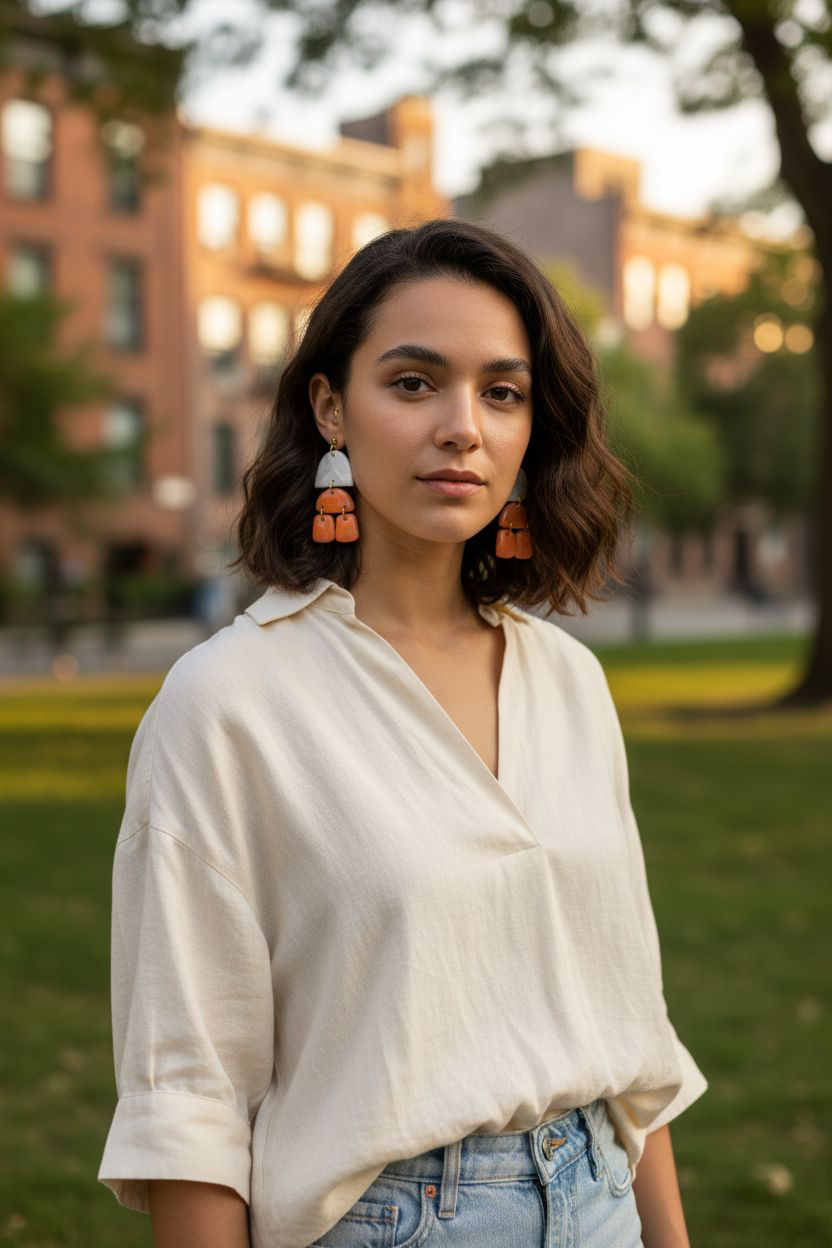White Textured Top + Orange Marbled Multi-Drop Earrings