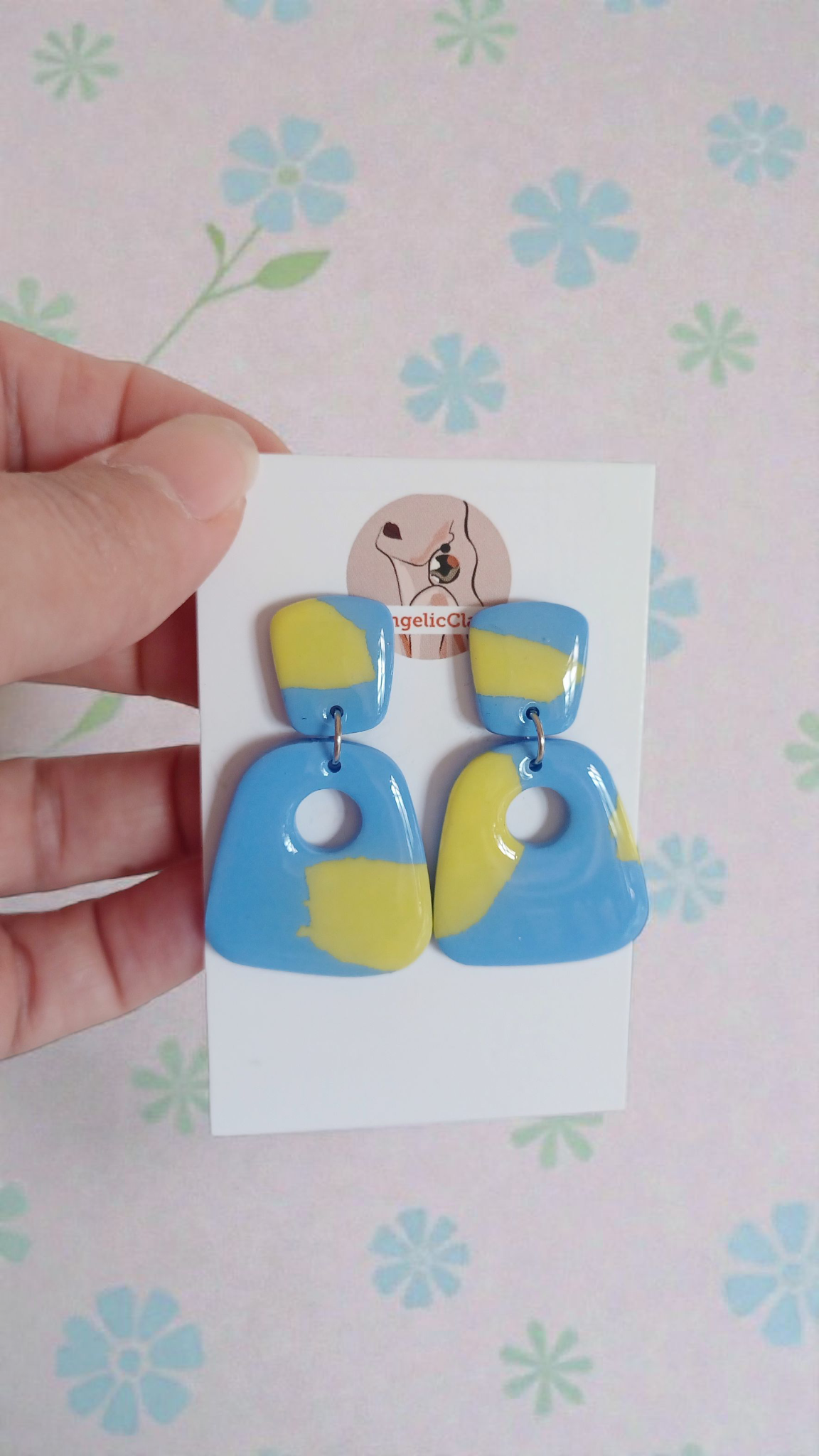 Blue and yellow clays are conditioned and layered into curved colour blocks. Shapes are hand-cut, baked, polished, and finished with resin. Handmade in Ireland.