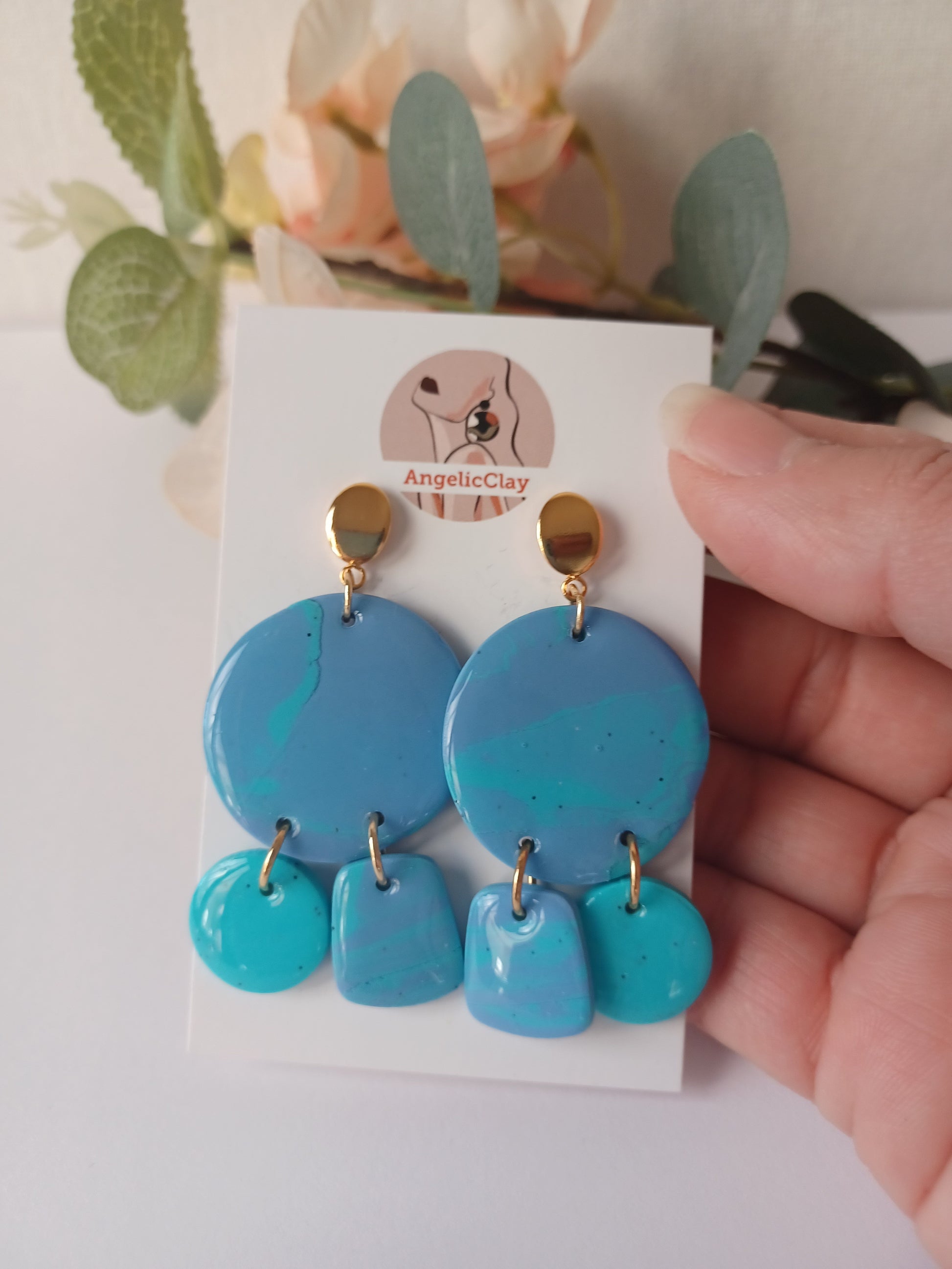 Elegant handmade earrings in blue and turquoise tones, featuring a glossy round base and geometric dangling pieces. Finished with gold-tone hypoallergenic posts. A soft, modern design that suits both everyday and special occasions.