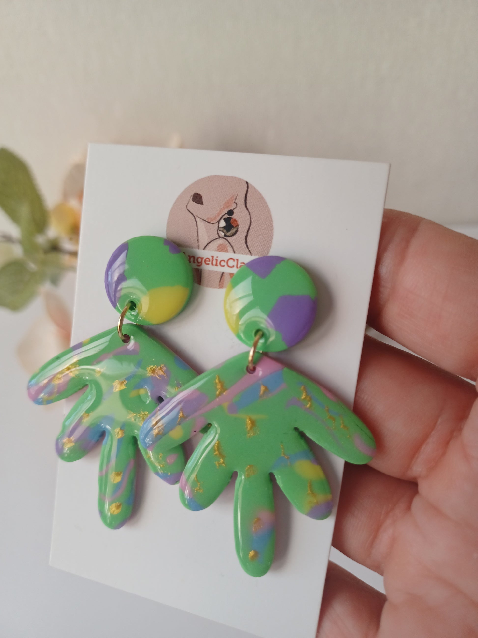 Handmade polymer clay earrings featuring a playful abstract hand shape in bright green with soft lilac and yellow accents, finished with delicate touches of gold foil. Each piece is resin-coated for a high-gloss, glass-like shine. Lightweight, bold and artistic — perfect for anyone who loves colourful statement jewellery.