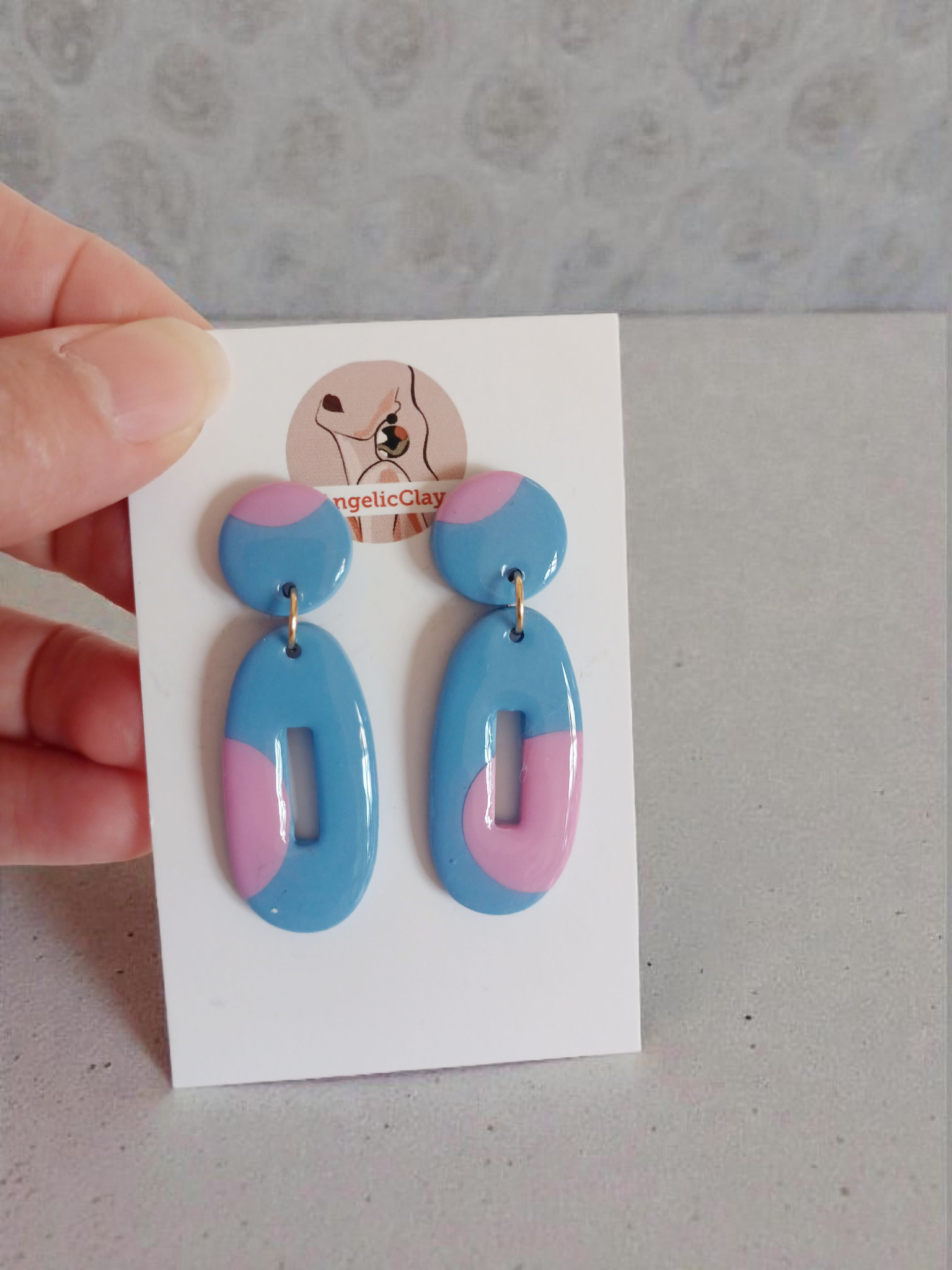 Pink and blue clay are blended into a curved colour-block style. Shapes are cut, baked, sanded, and coated with resin. Fully handmade in Ireland.