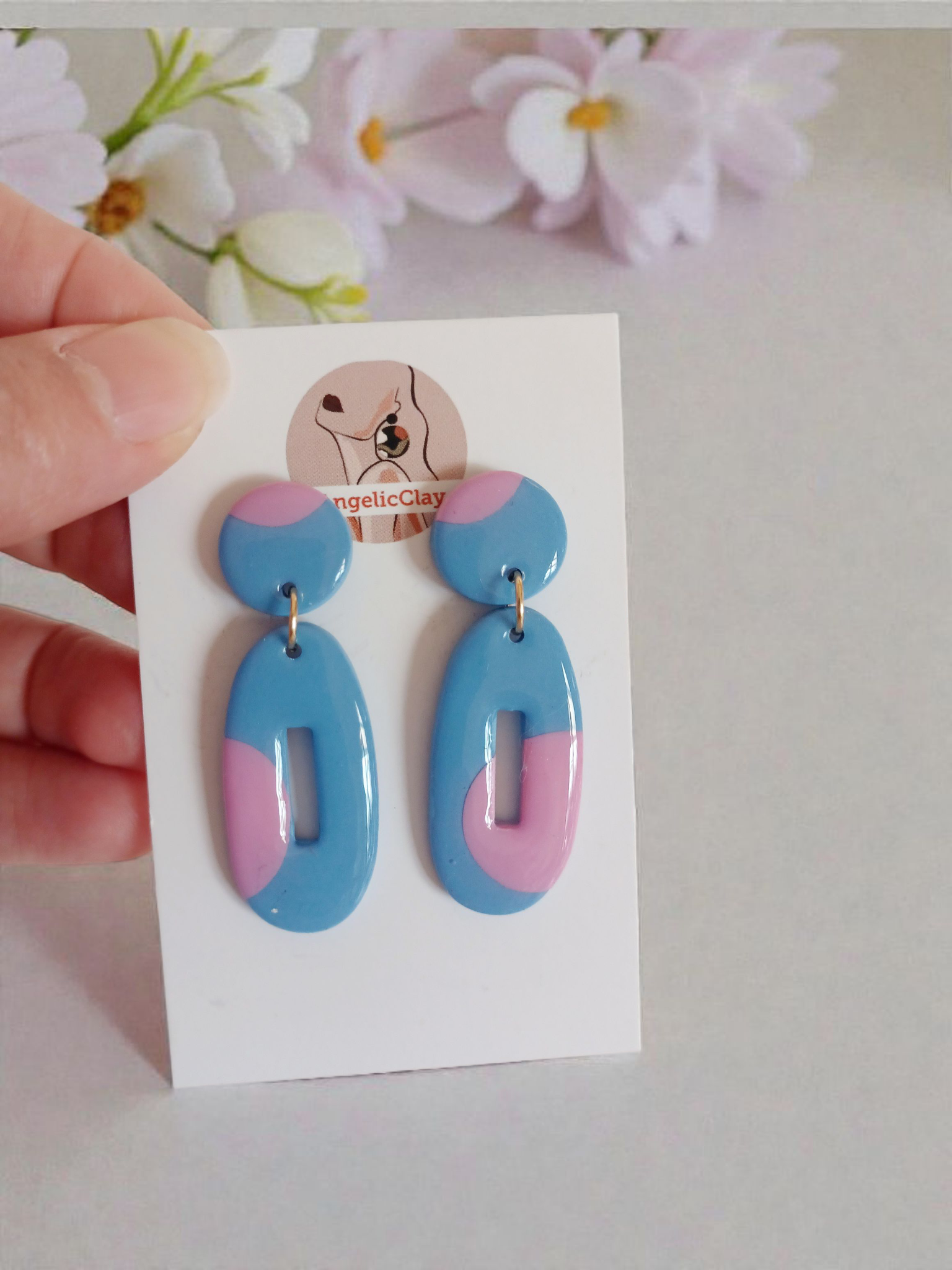 Handmade Polymer Clay Earrings | Blue Pink Oval Cut-Out Statement Dangles | Resin Coated