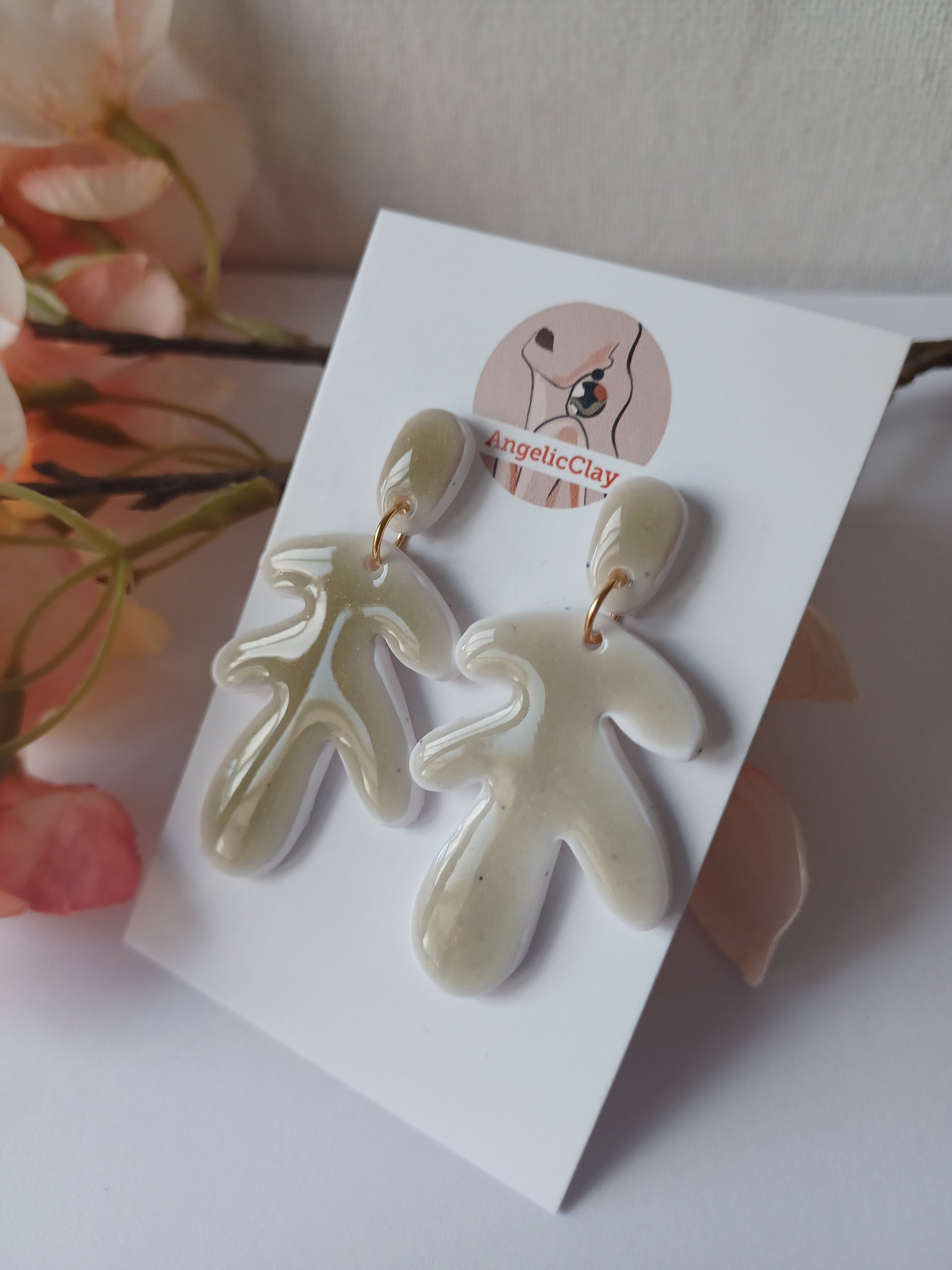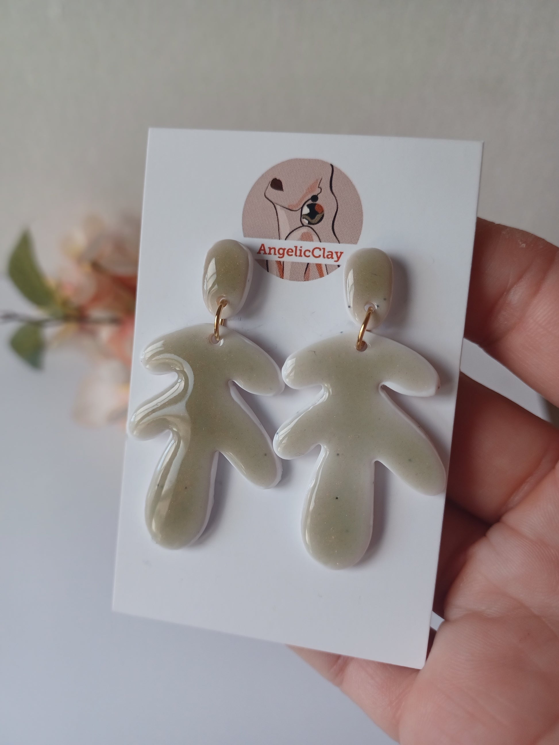Modern and artistic polymer clay earrings with an organic, abstract silhouette in a soft light-green tone. Their flowing shape gives them a minimalist yet expressive look. Despite their size, they remain very lightweight and comfortable thanks to the clay structure and resin finish.