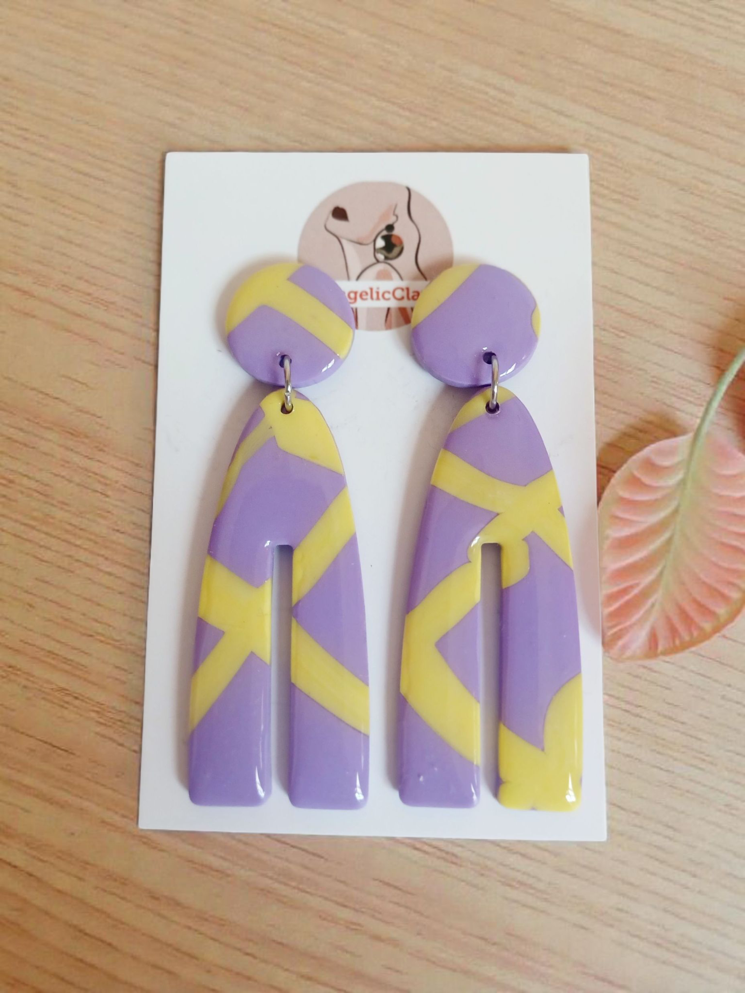 The lilac base is rolled out first, then thin strips of yellow clay are layered on top to create the graphic striped pattern. The patterned sheet is flattened to fuse the colours and then each shape is hand-cut. After baking, the pieces are sanded, coated with resin, and fully cured. The earrings are then assembled with metal jump rings and mounted on hypoallergenic posts. Handmade in Ireland with care and attention to detail.