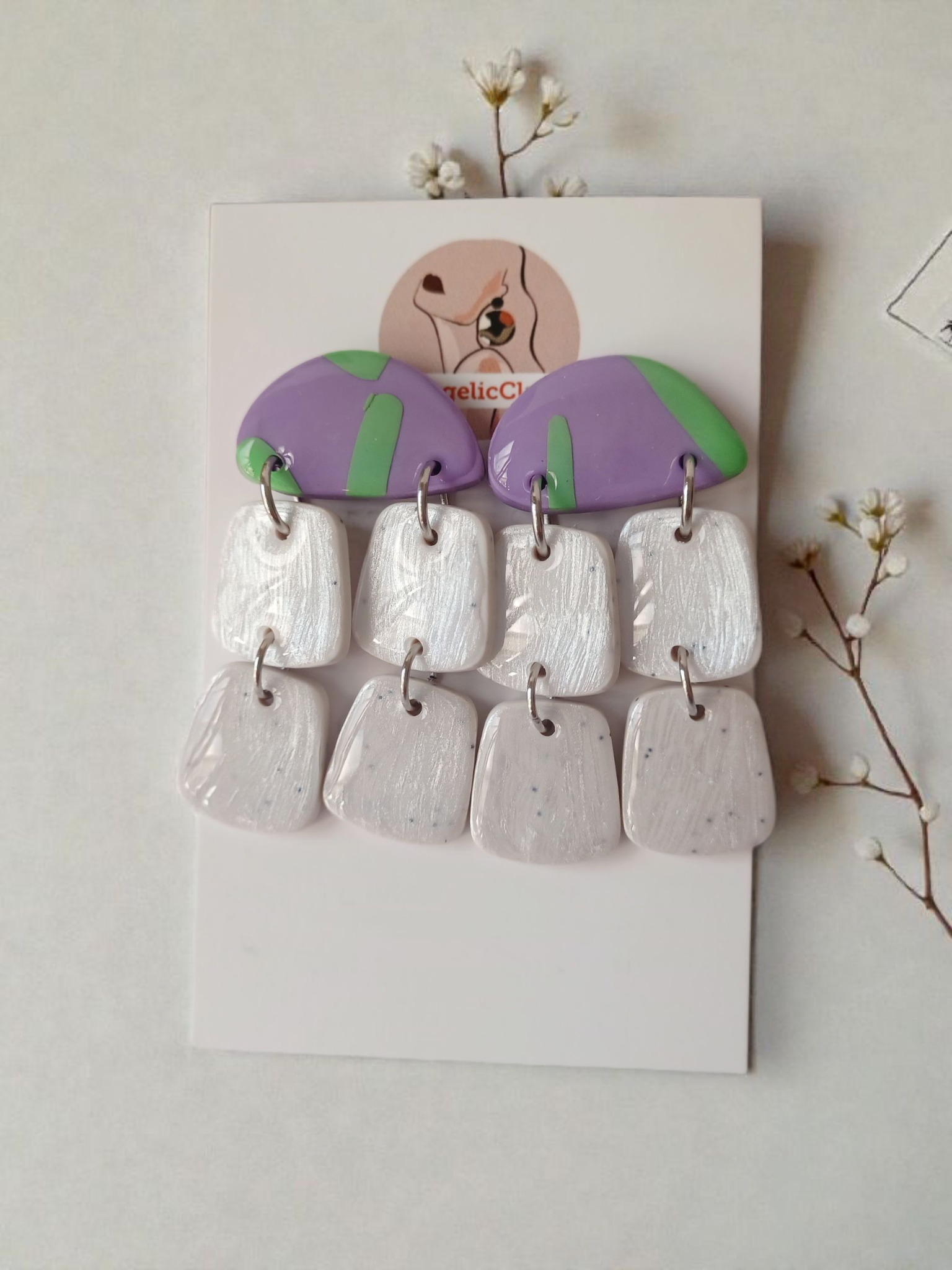 The purple-and-green tops are created from layered polymer clay and coated in resin. The white drops are textured by hand to give a pearly, brushed-metal look. After baking, each piece is sanded and assembled with stainless-steel jump rings. Handmade in Ireland.